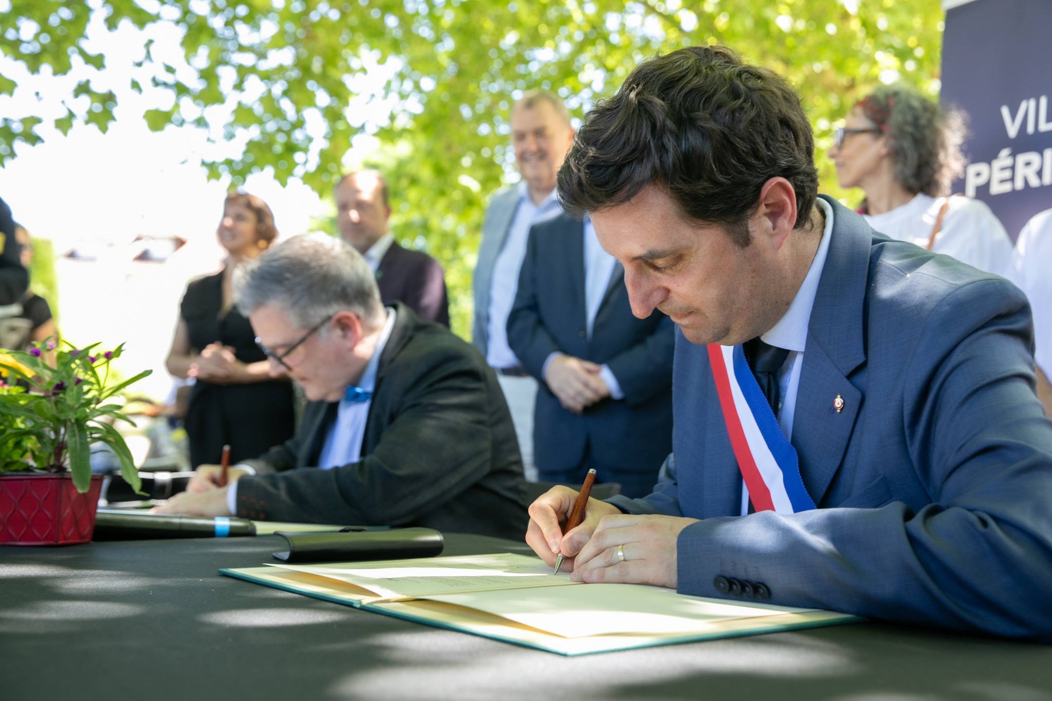 Signature de la charte de jumelage par Messieurs les Maires Mario Bastille et Eymeric Lavitola.