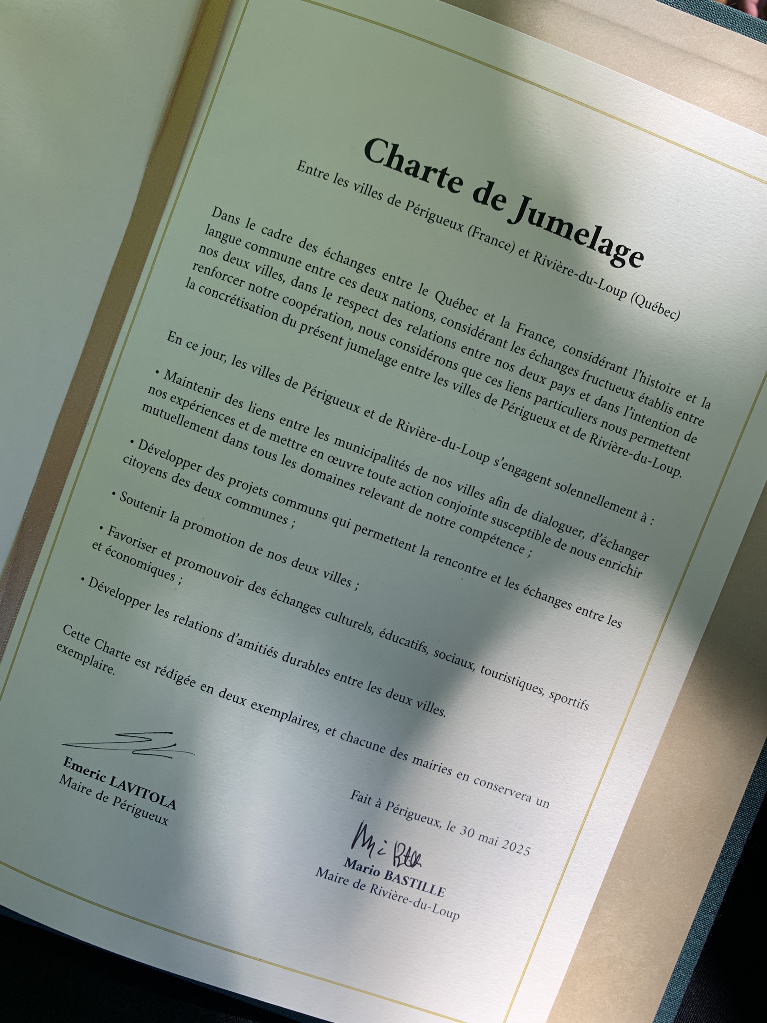 Le vendredi 30 mai 2025, une première version de la charte d’amitié qui unit désormais les deux communautés a été signée. Aux côtés du maire périgourdin Emeric Lavitola, et le maire de Rivière-du-Loup, Mario Bastille se sont deux délégations qui officialisent un nouveau partenariat riche de promesses. Cette entente transatlantique pourrait encourager des emplois ou de stages étudiants, des échanges culturels et sportifs, la création de ponts entrepreneuriaux, d’échanges scolaires. Le relais sera assuré désormais par l’Association Jumelage Rivière-du-Loup/Périgueux, un organisme sans but lucratif local, pris en charge par des citoyens, qui a comme mandat de faire connaître et promouvoir le jumelage et ses avantages.