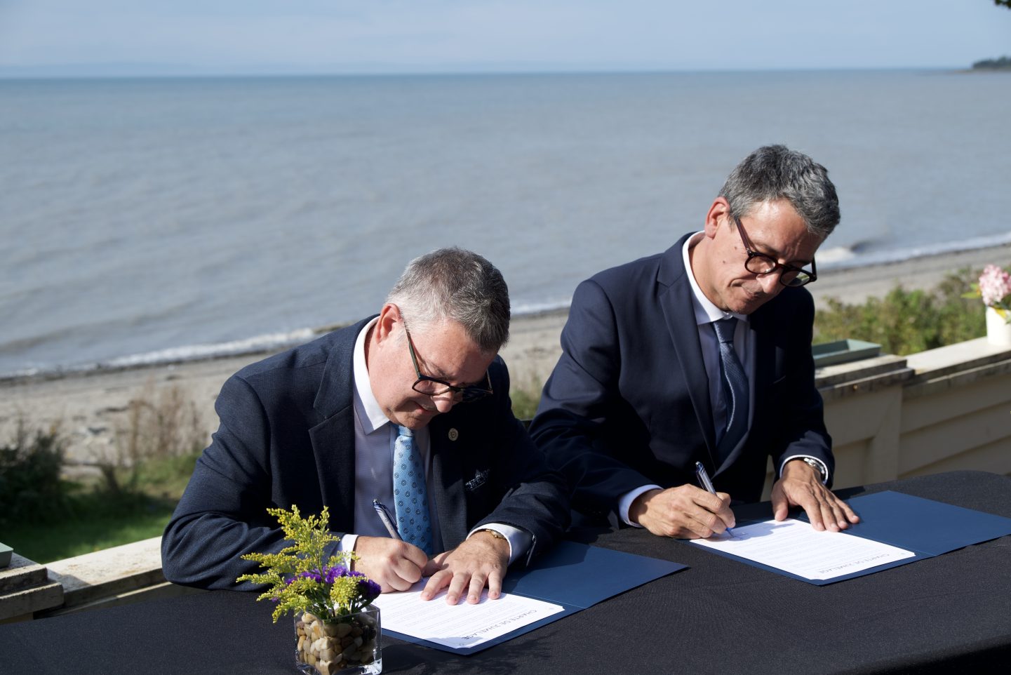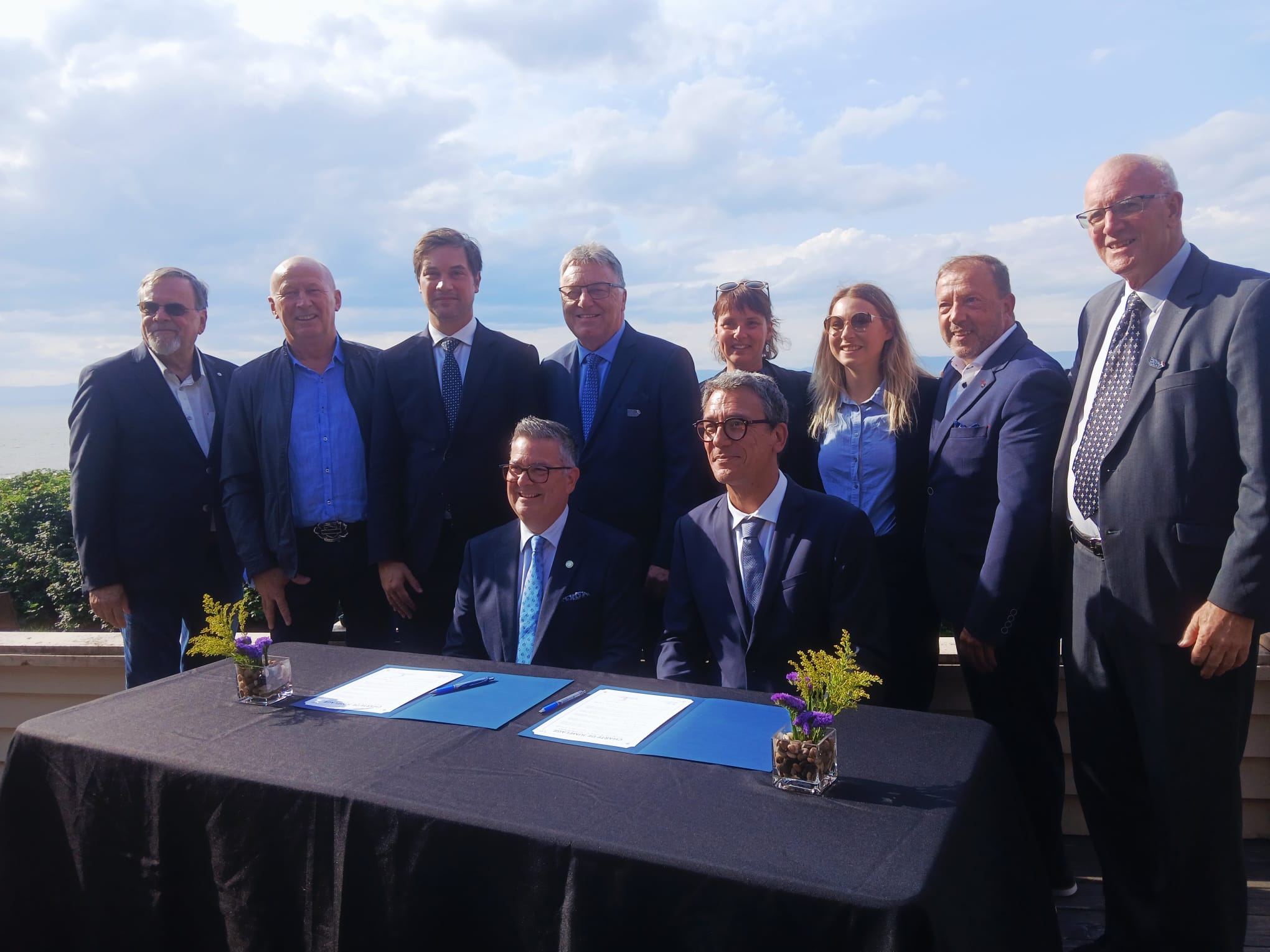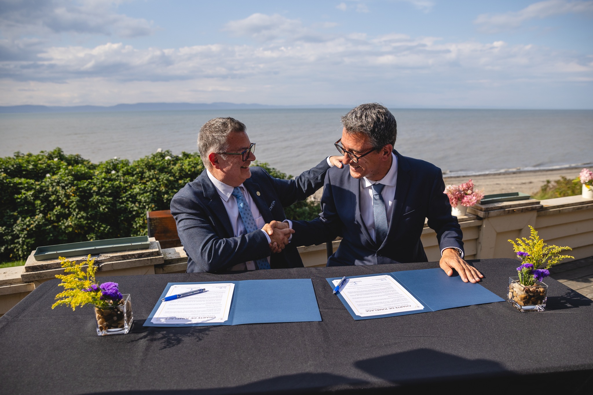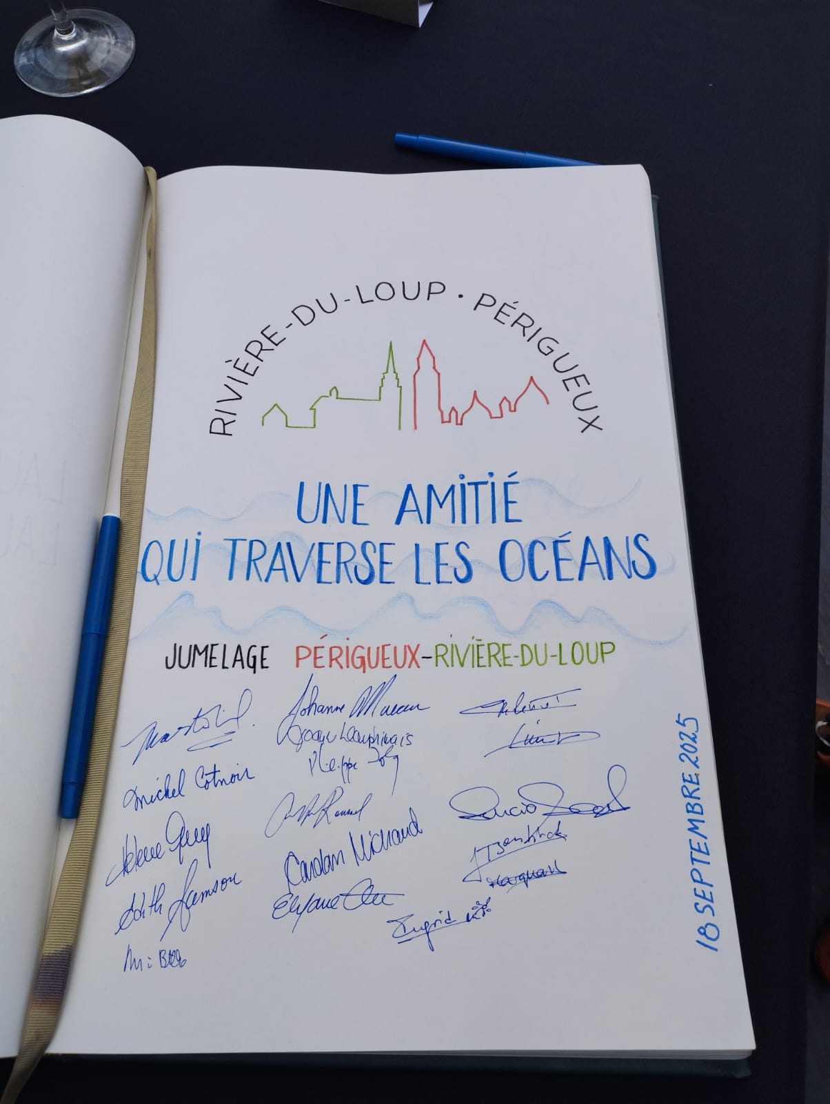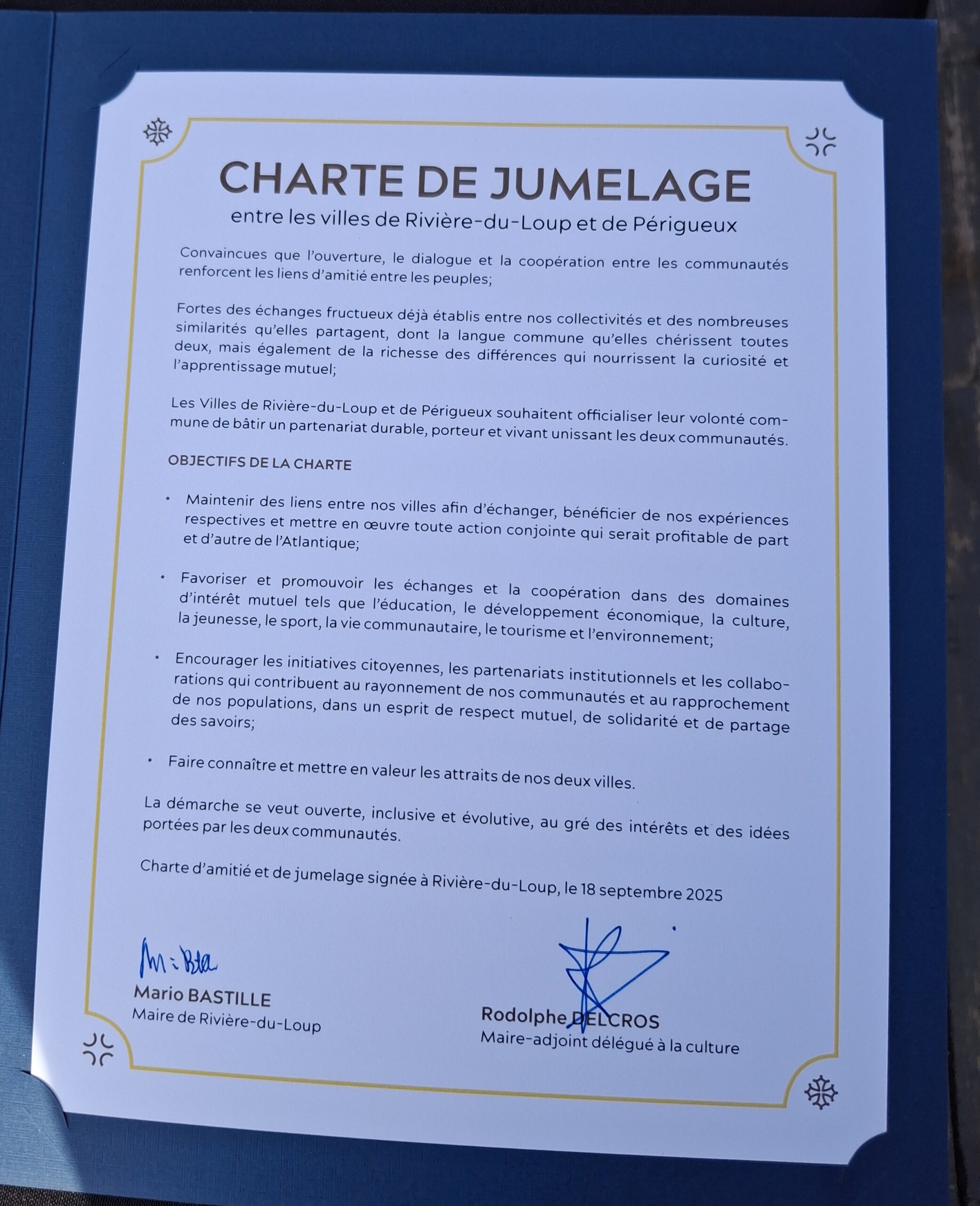 Une délégation de la chambre de commerce et d’industrie de Périgueux, mais aussi de l’université de Bordeaux-Montagne accompagnée par Monsieur Rodolphe Delcros, maire-adjoint délégué à la culture à la Ville de Périgueux et Madame Marion Favard Adjointe de quartier à la participation des jeunes et aux jumelages a rejoint Rivière- du-Loup du 18 au 21 septembre 2025 pour compléter la signature de la charte. Un jumelage donc confirmé solennellement en présence de Mario Bastille et plusieurs dignitaires, dont Éric Lamouroux, Consulat Général de France à Québec.