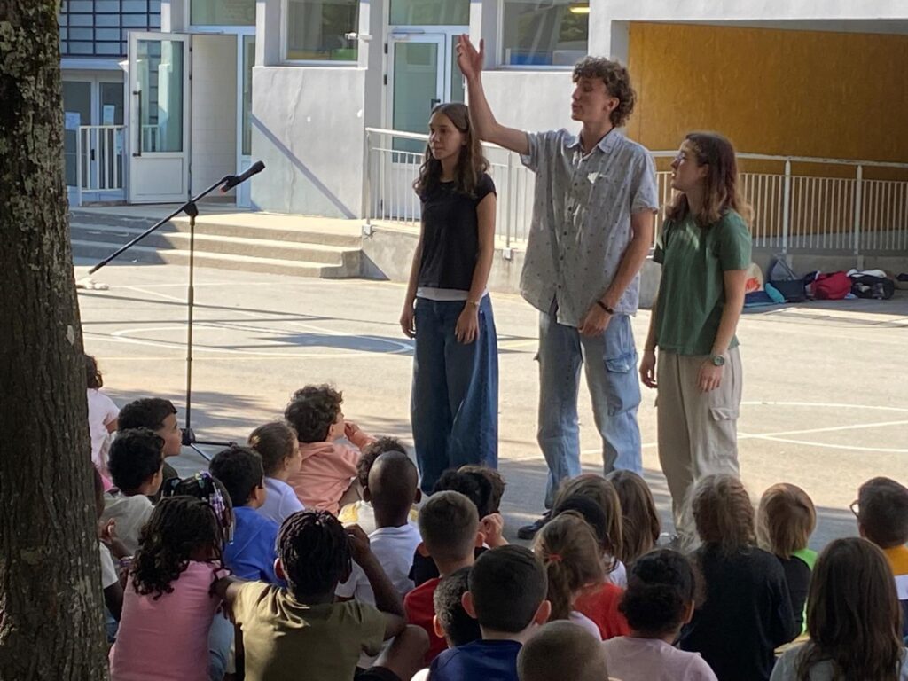 Ce jeudi 16 octobre, Victor, Ariane et Camille accompagnés de leur professeur de français Annie, ont proposé à chaque classe volontaire des ateliers d’écriture de courts textes poétiques. Enthousiastes, les élèves même les plus timides ont produit des poèmes qu’ils ont pu réciter devant leurs 200 camarades bien attentifs réunis dans la cour.