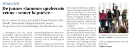 Du 13 au 18 octobre 2025, l’association Périgord-Québec a accueilli 3 jeunes slameurs, lauréats québécois du concours national Slam-Jeunesse Québec-France 2025. L’objectif est de faire découvrir le slam dans les établissements scolaires de Dordogne. Ils ont rencontré environ 700 écoliers de Dordogne.