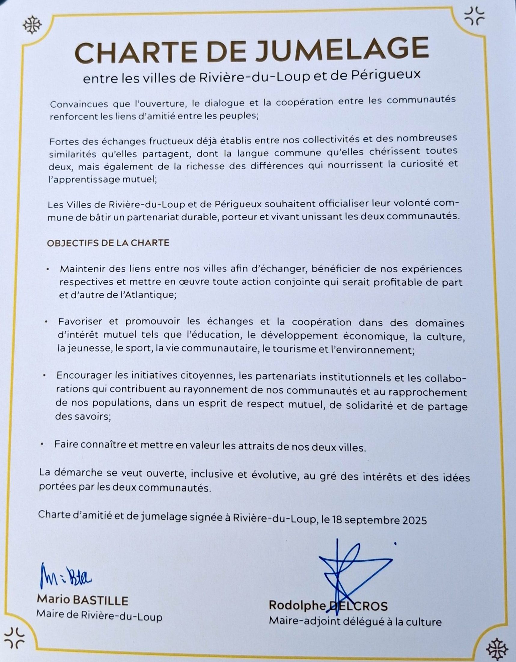 La délégation de Périgueux est allée à son tour au Québec en septembre 2025. La chartre signée entre les 2 villes jumelles réaffirme les objectifs de ce rapprochement.